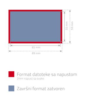 Dokumenti se izrađuju po mjeri; u format dokumenta potrebno je dodati napust sa svih strana od 2mm preko ruba završenog formata.