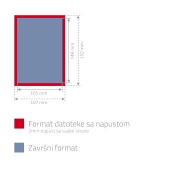 Dokumenti se izrađuju po mjeri; u format dokumenta potrebno je dodati napust sa svih strana od 2mm preko ruba završenog formata.