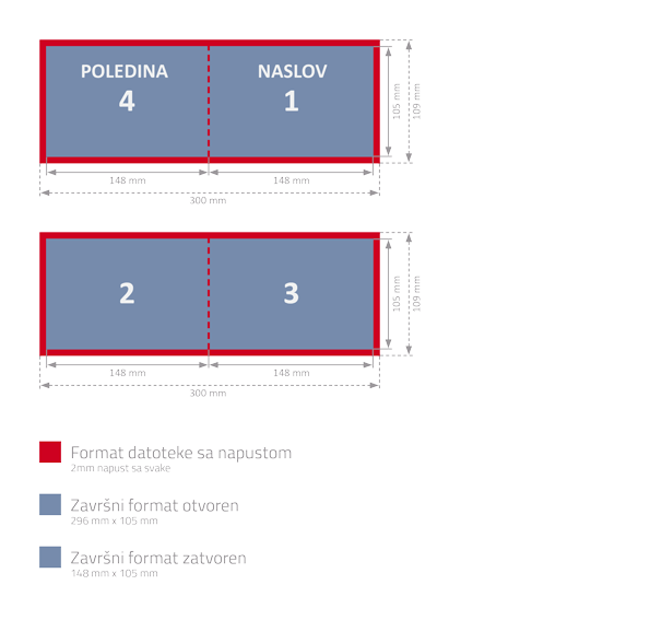 Dokumenti se izrađuju po mjeri; u format dokumenta potrebno je dodati napust sa svih strana od 2mm preko ruba završenog formata.