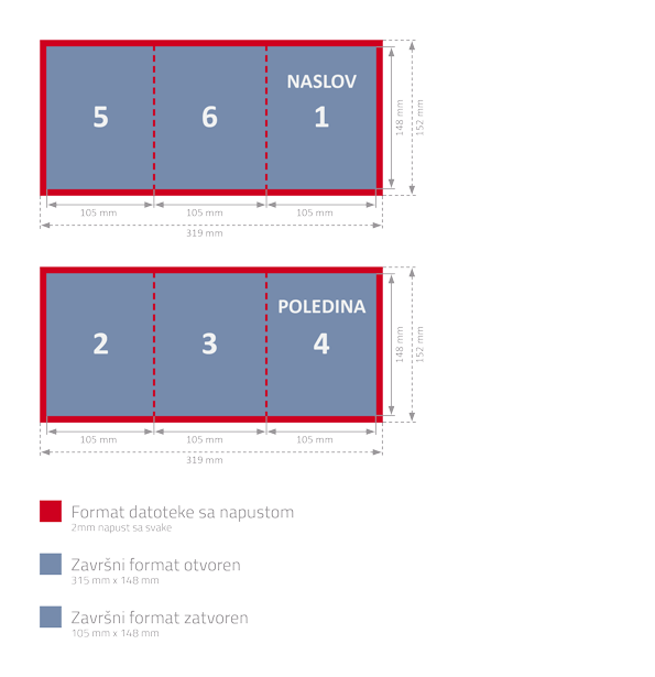 Dokumenti se izrađuju po mjeri; u format dokumenta potrebno je dodati napust sa svih strana od 2mm preko ruba završenog formata.