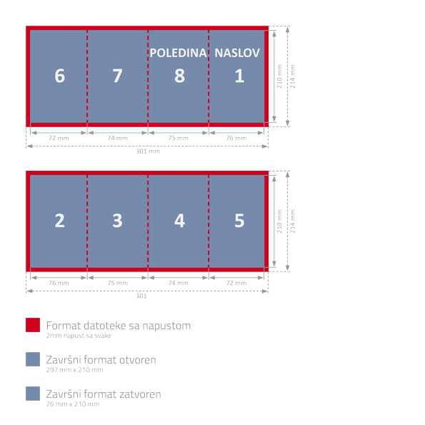 Dokumenti se izrađuju po mjeri; u format dokumenta potrebno je dodati napust sa svih strana od 2mm preko ruba završenog formata.